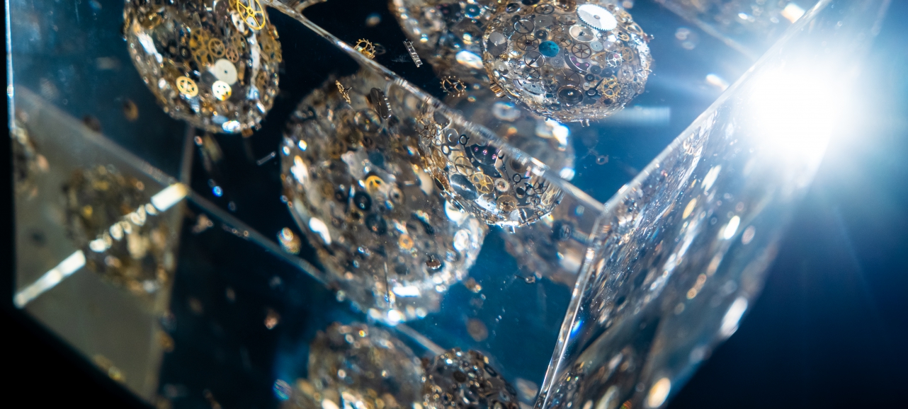 Созвездие сфер из деталей винтажных часов, дрейфующих в эфемерной кубической галактике. Замершие во времени, эти внутренние структуры словно вращаются рядом с друг другом, но на самом деле каждая из них остановилась на своем космическом пути.