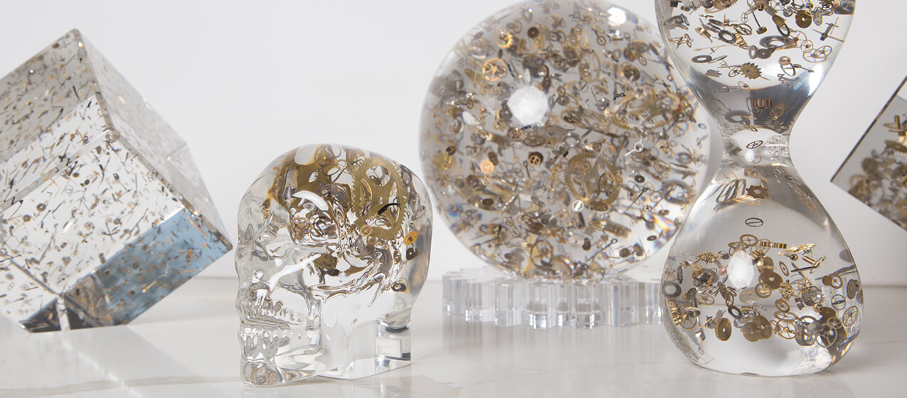 Шестеренки, барабаны, колеса, пружины, ходовые колеса, трибы, мосты и стрелки – каждая деталь часового механизма рассказывает свою удивительную историю. Мастера Berd Vaye заботливо восстанавливают часовые элементы, полируют их, а затем скрупулезно создают из них неповторимые композиции и заключают в форму из благородной, кристально чистой и ударопрочной смолы Lucite®.