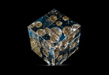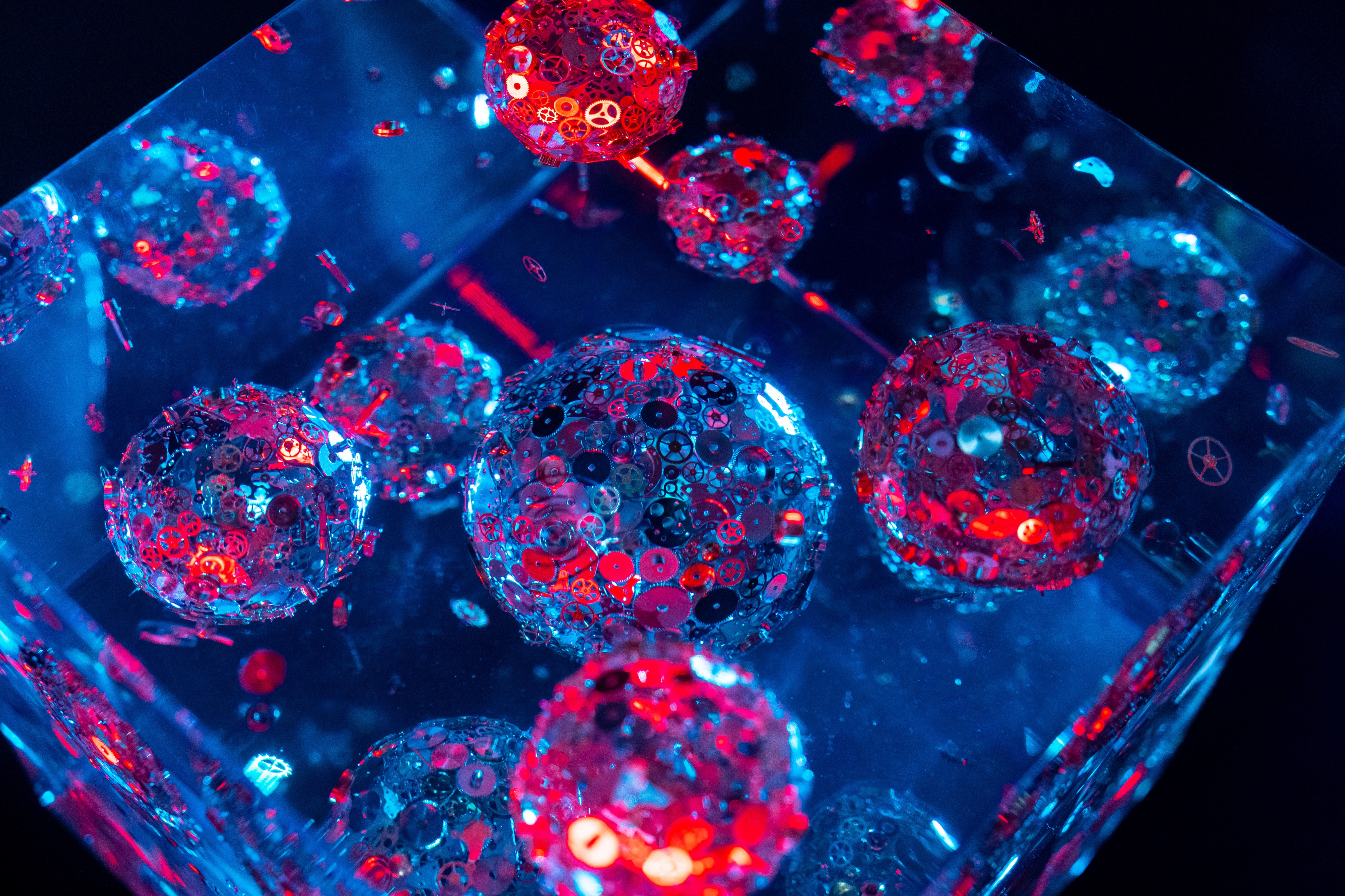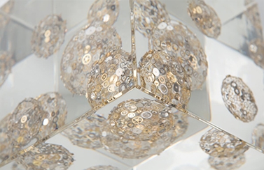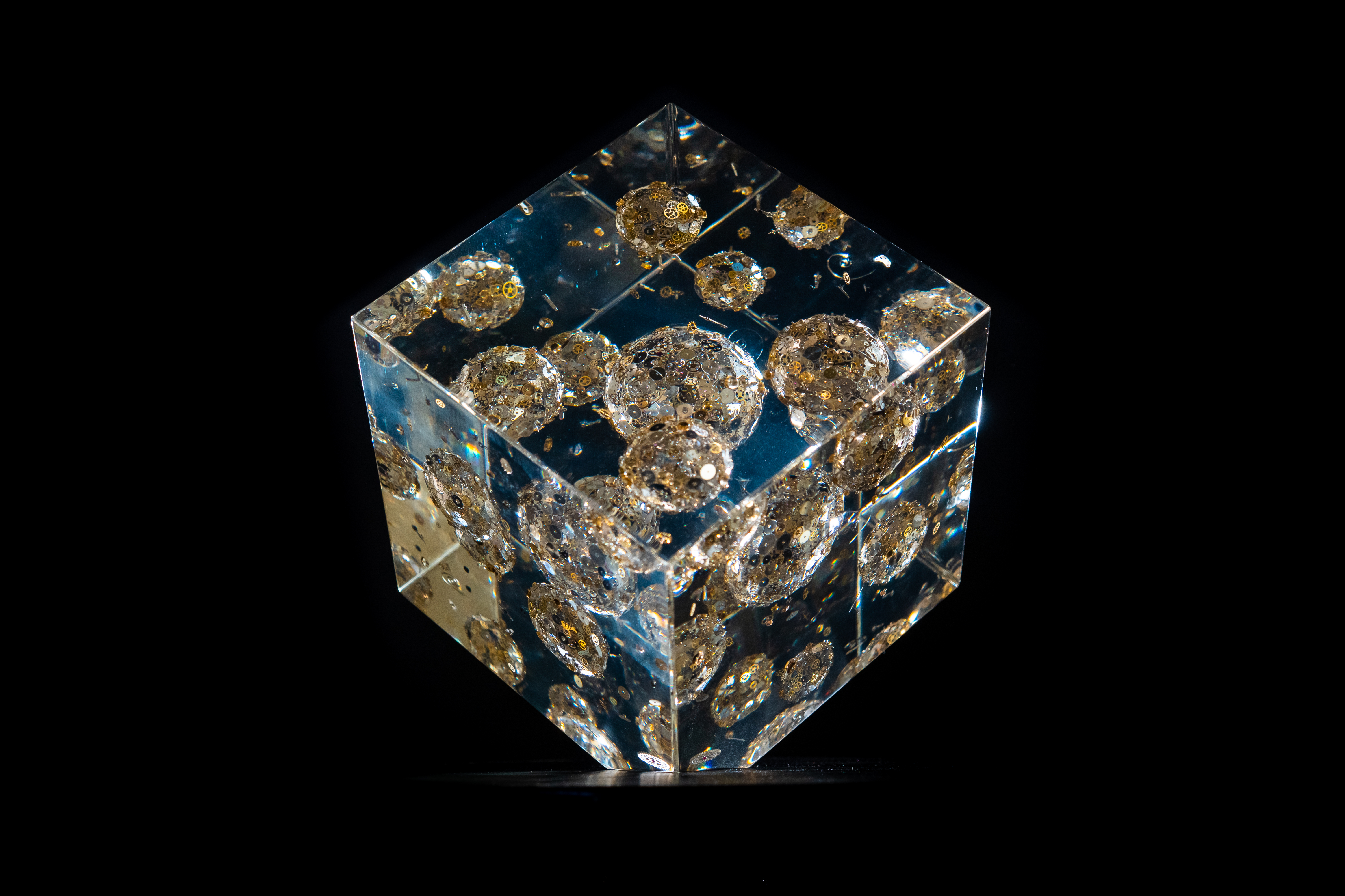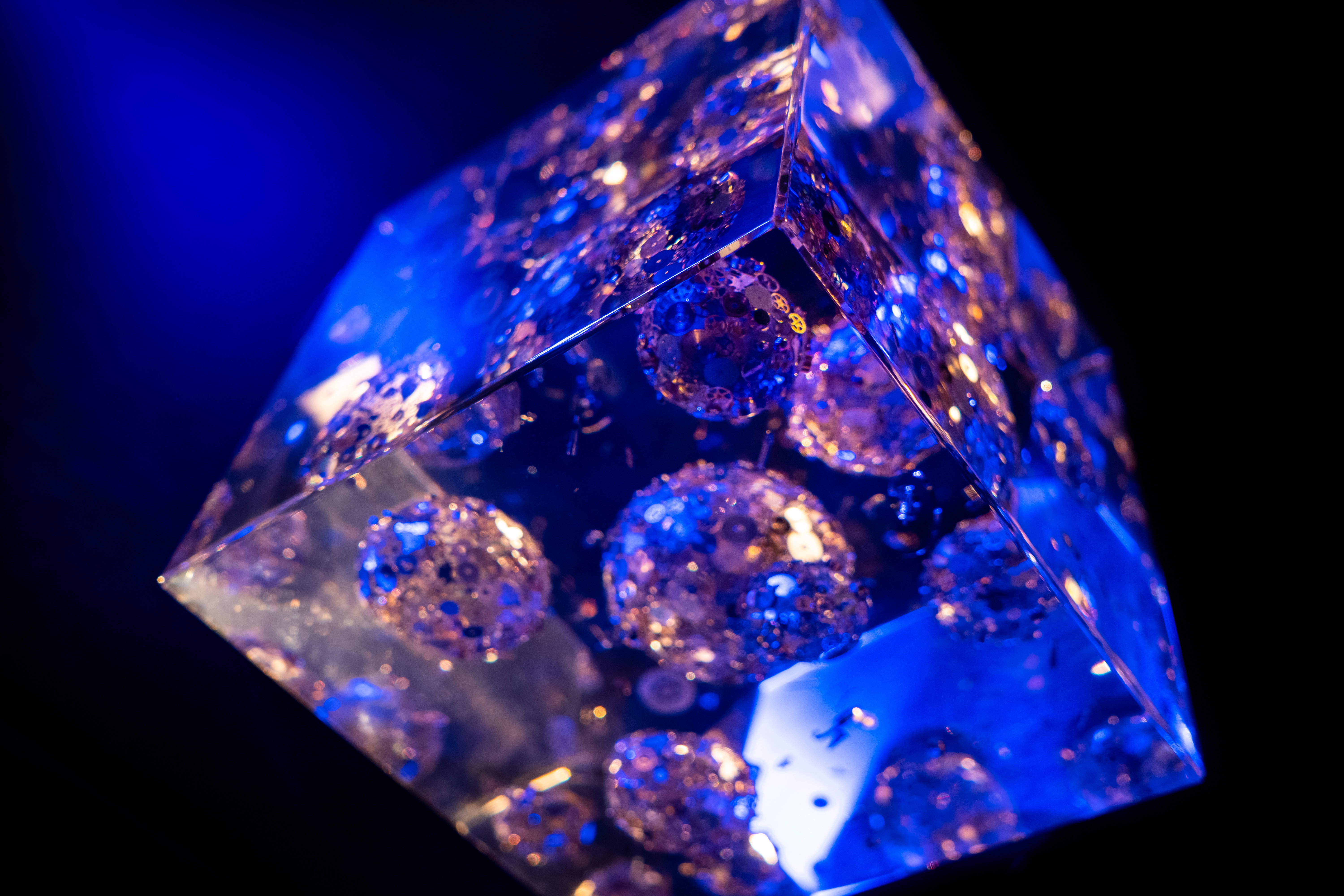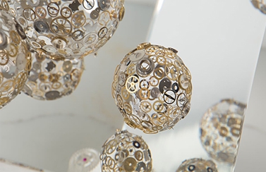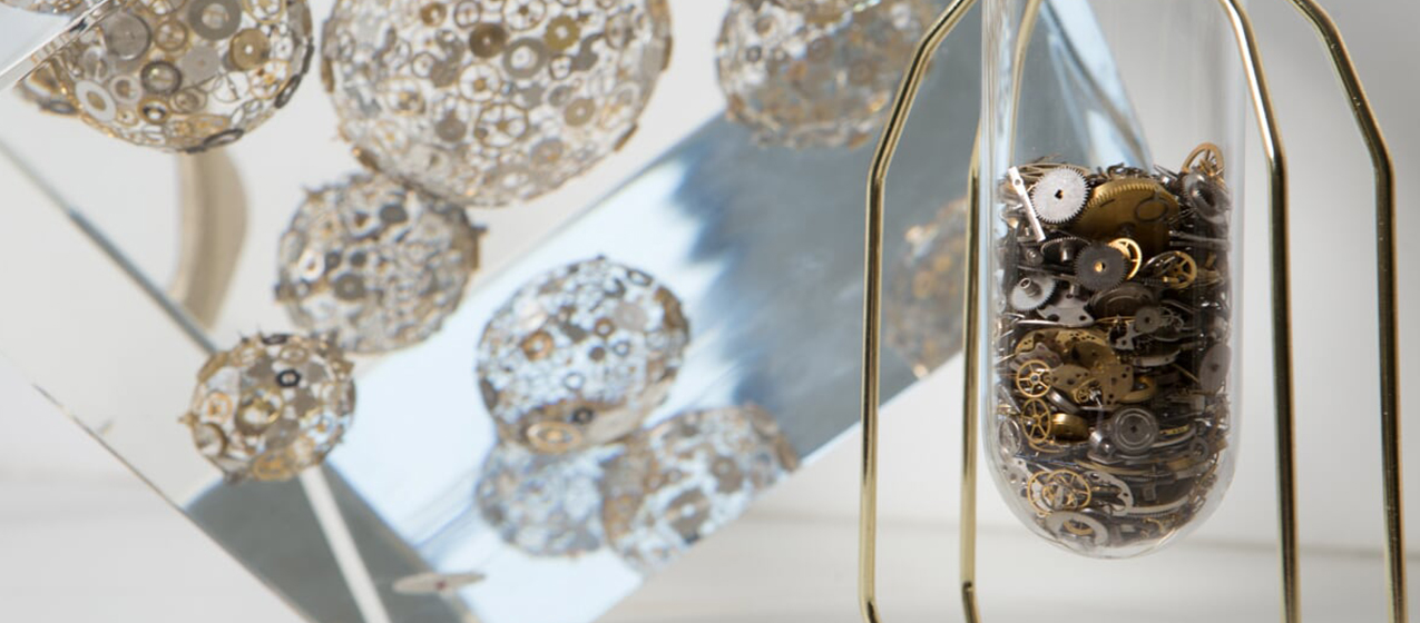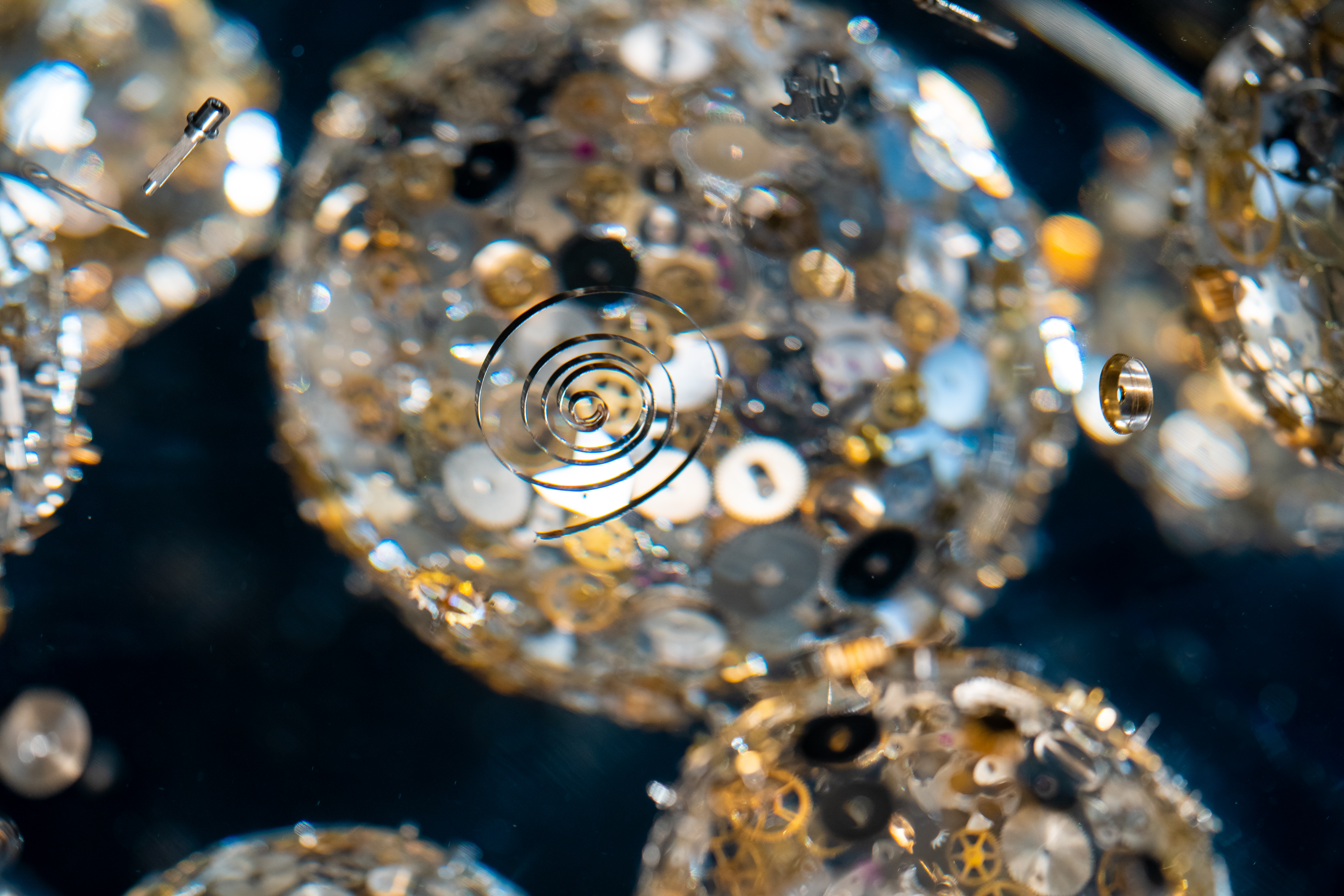 Созвездие сфер из деталей винтажных часов, дрейфующих в эфемерной кубической галактике. Замершие во времени, эти внутренние структуры словно вращаются рядом с друг другом, но на самом деле каждая из них остановилась на своем космическом пути.